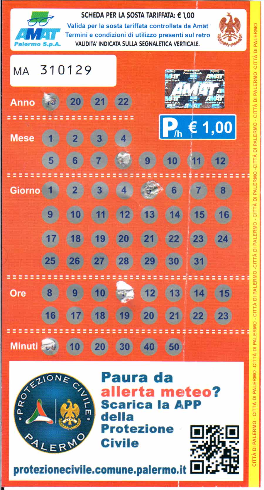 Стоимость парковок в районе Mondello, где находятся ближайшие к Палермо пляжи стоят 1 евро в час, в синей будочке покупается парковочный билет, похожий на лотерейный, на нём затирается дата и время, после чего кладёте его под лобовое стекло на видное место.