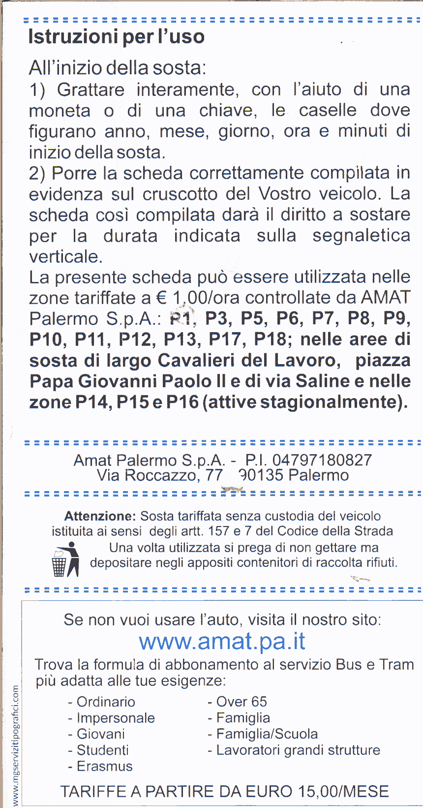 Пропуска (перевод на итальянский: pass [пасс]) продаются в офисе компании Amat на улице via Borrelli, в уполномоченных агентсвах Aci и на сайте муниципалитета Палермо, где также перечислены точки продаж.