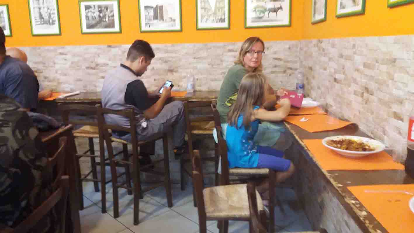 Обедали, примостившись на табуретках, плечо к плечу с каким-то итальянским сантехником. В тесноте, да не в обиде!
