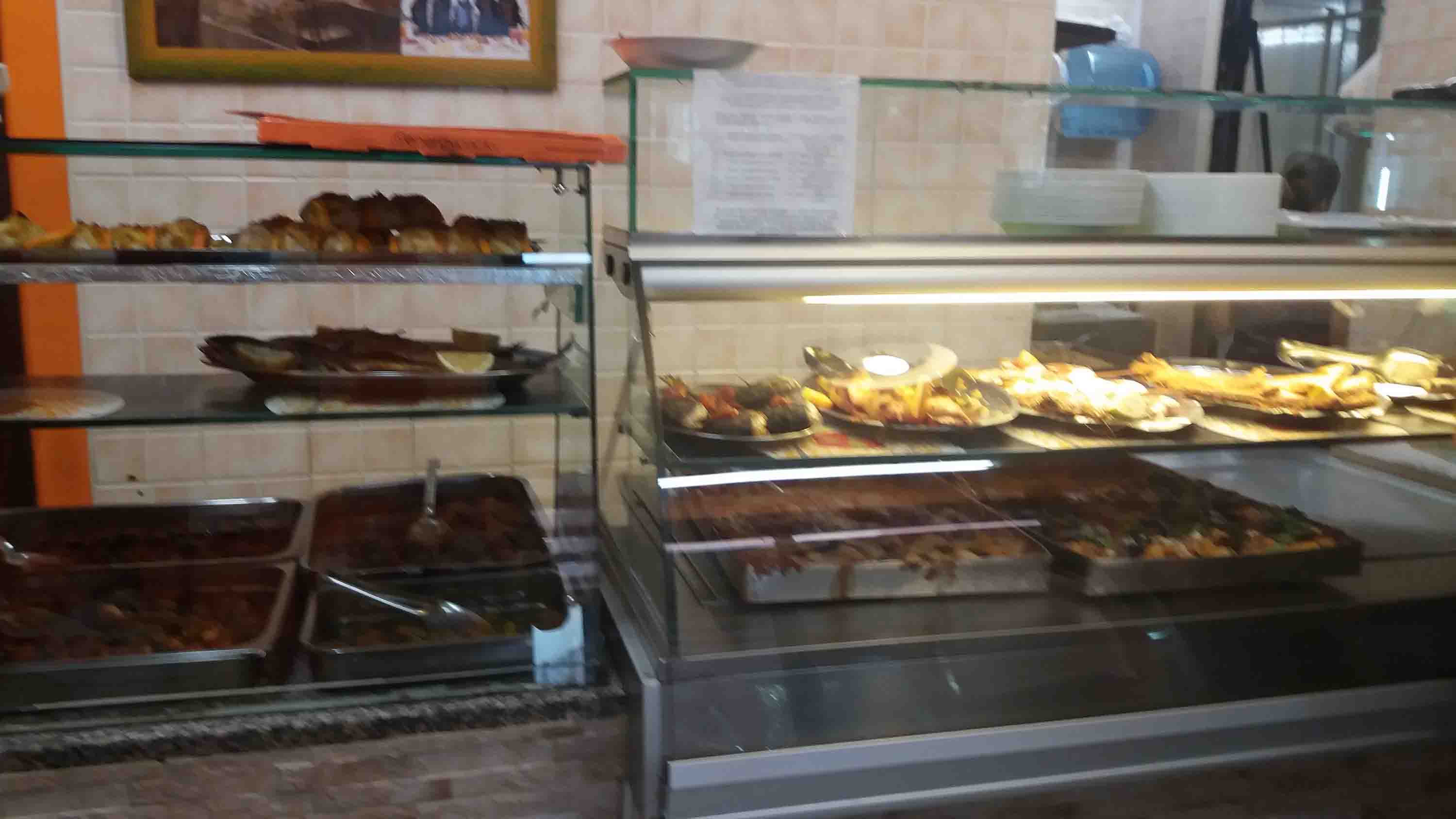 И тут мы заметили, что кроме большой веранды со столиками мы заметили, что внутри, где кулинария для продажи на вынос, тоже есть несколько столов и табуретки для быстрого потребления.