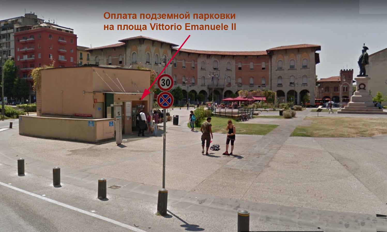 3) Комфортный, но дорогой вариант - подземная парковка на 380 машиномест под площадью Piazza Vittorio Emanuele II в 150 метрах от вокзала. Тариф 2,50€ в чаc либо 19€ в день. Открыта 24 часа, но ночью нет персонала, если захотите что-то спросить через итальянского переводчика. Оплата только кредитной картой.