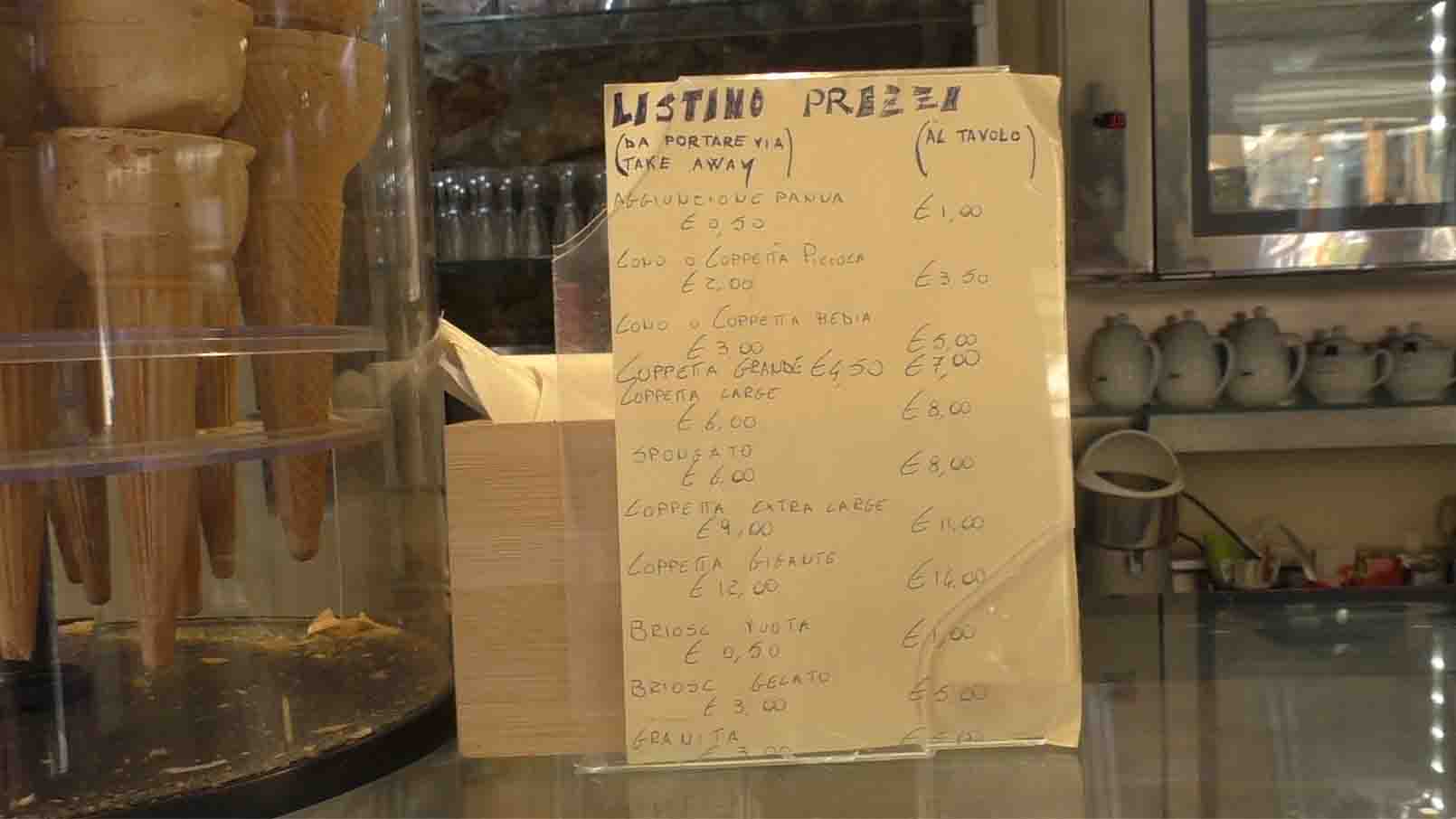Как видно из меню кафе-мороженного (Gelateria), маленький рожок стоит 2 евро, если унести его с собой, и 3,5 евро, если скушать за столиком (см. раздел Мороженное в Италии).
