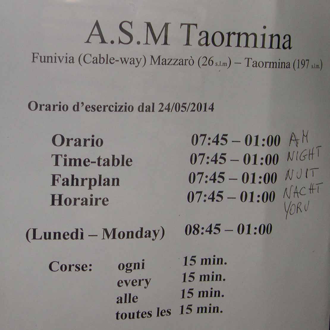 . Ещё в Таормине останавливается много поездов. Железнодорожный вокзальчик очень красивый и сам является достопримечательностью. Но для итальянского переводчика осталось загадкой, как добирать со станции, которая внизу, до города, который наверху. Я шёл пешком минут 30, вдоль обочины, но это для экстремалов. Автобусы от станции ходят 3 раза в день и не согласуются с электричками. Такси там я тоже не обнаружил.